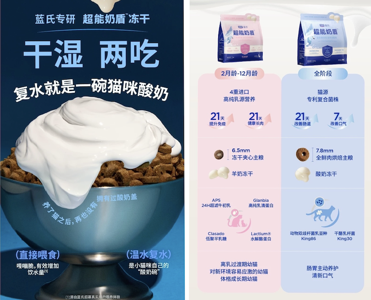 在实践层面,蓝氏以科学之力赋能宠物天性营养,实现了科学喂养与情感体验的深度融合。其最新推出的“超能奶盾系列”采用“鲜肉撞奶”独特工艺,复水即可还原一碗营养丰富的奶泡粮,创新性地实现干湿两吃,唤醒猫咪舔舐天性。该设计不仅满足幼猫离乳期的天性需求,也为成年猫咪带来更具趣味的进食体验。